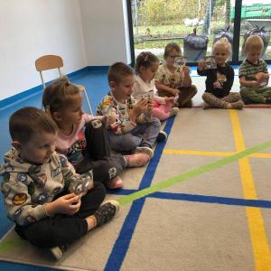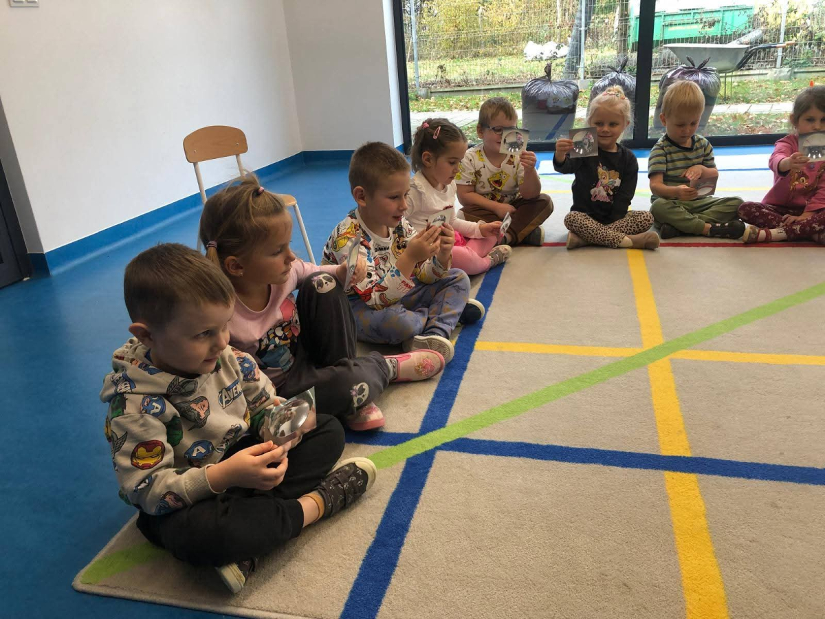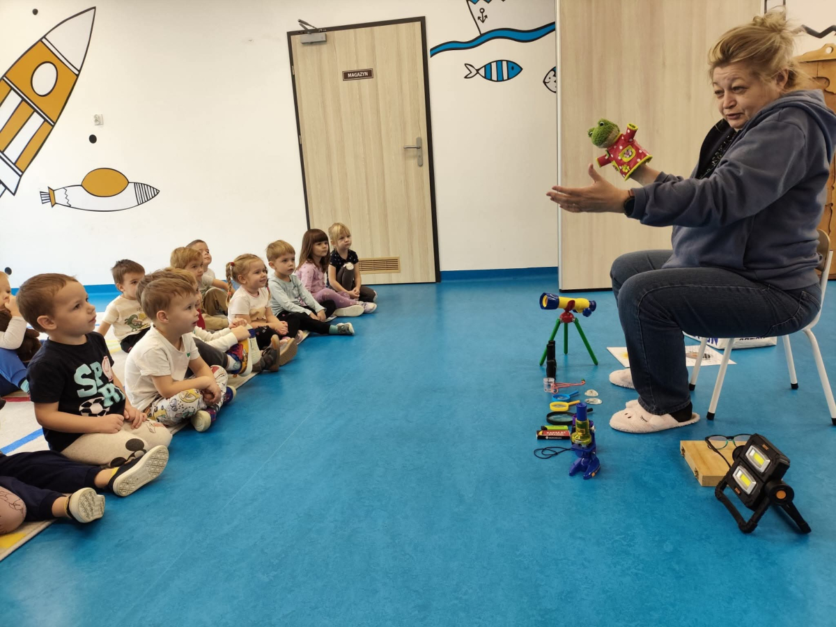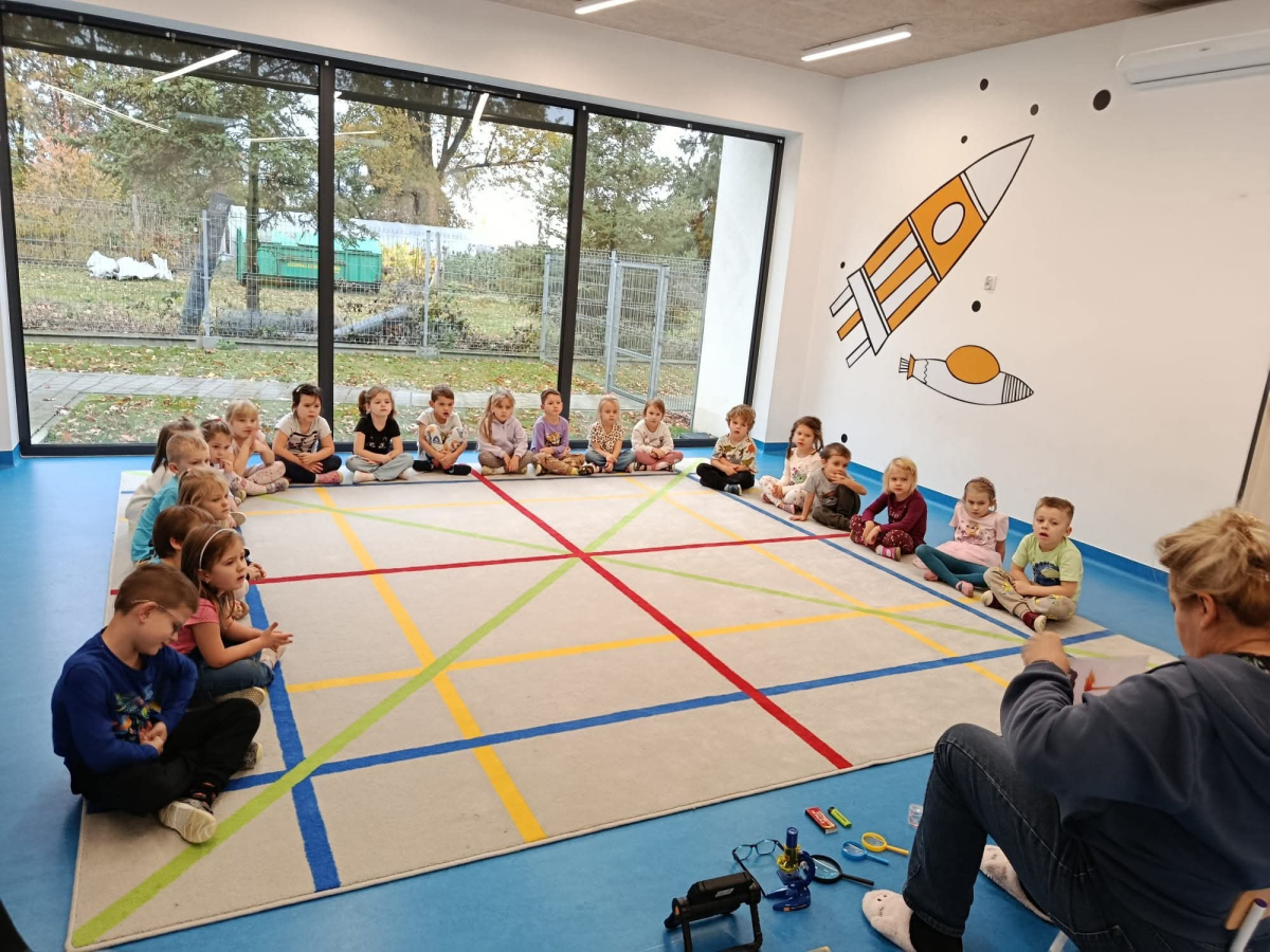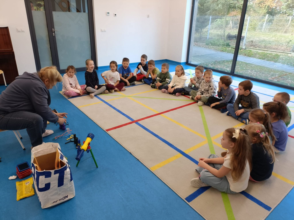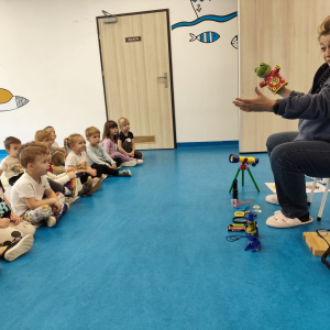 Dnia 27.10 wszytskie przedszkolaki uczestniczyły w zajęciach prowadzonych przez "Panią Szkiełko". Dzieci zobaczyły jak wygląda soczewka i w jakich sprzętach się znajduje. Poznały działanie lupy, mikroskopu, lornetki i lunety.