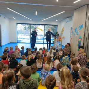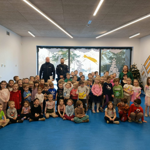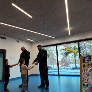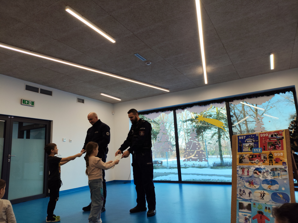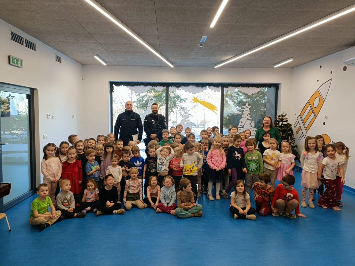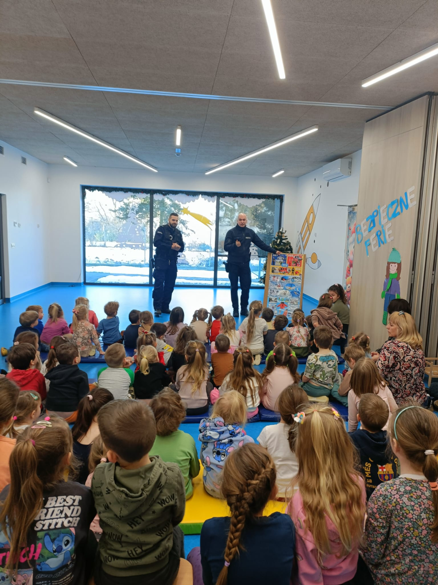 W naszym przedszkolu odbyło się spotkanie z policjantami, którego celem była rozmowa z dziećmi na temat bezpieczeństwa podczas ferii zimowych. Goście w ciekawy i przystępny sposób przypomnieli przedszkolakom zasady bezpiecznego zachowania w domu, na drodze, podczas zabaw na śniegu oraz w kontaktach z nieznajomymi.