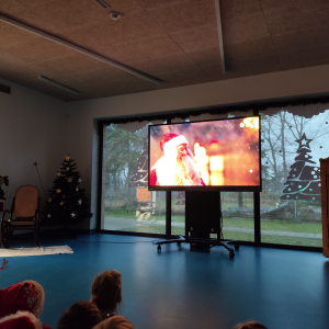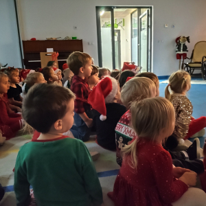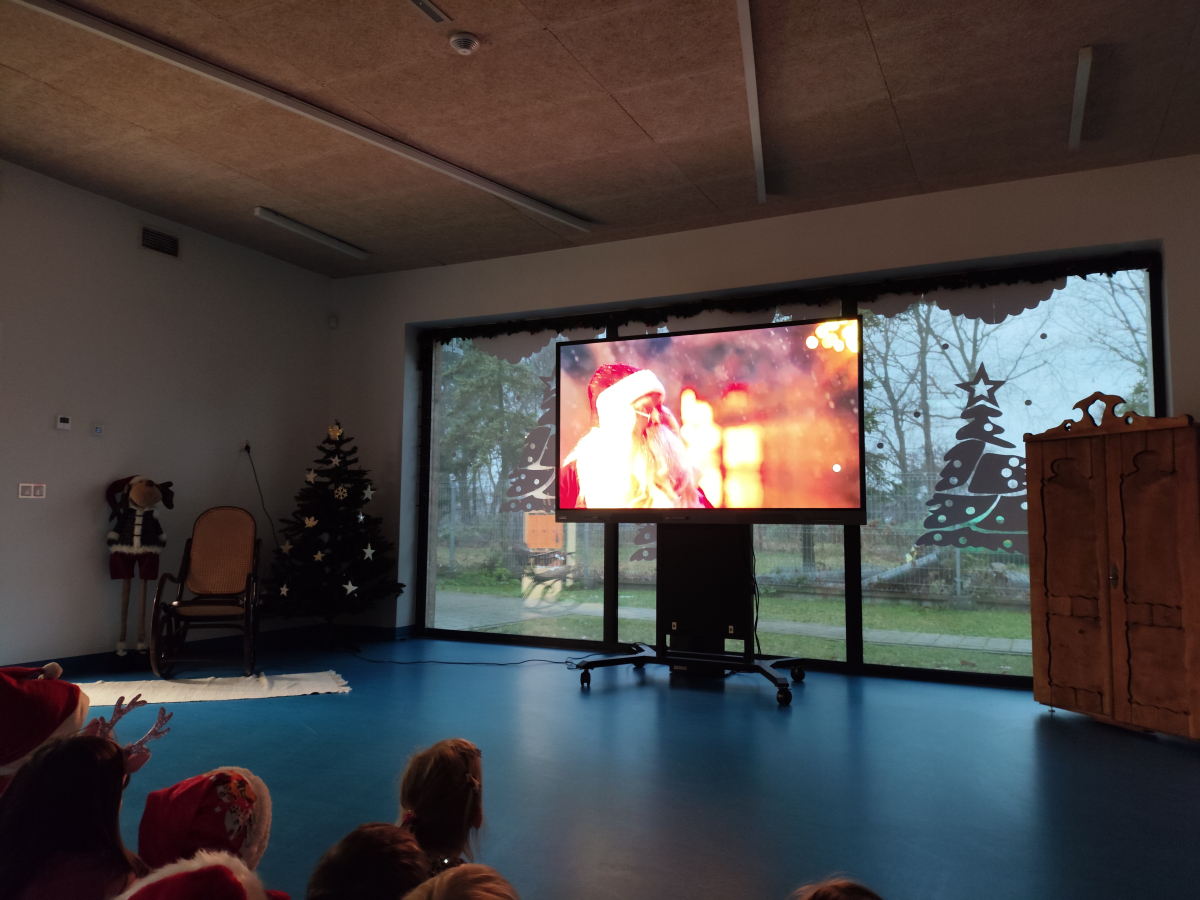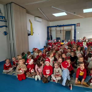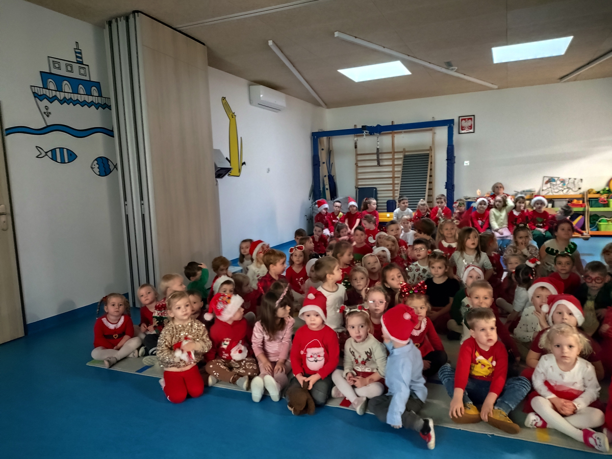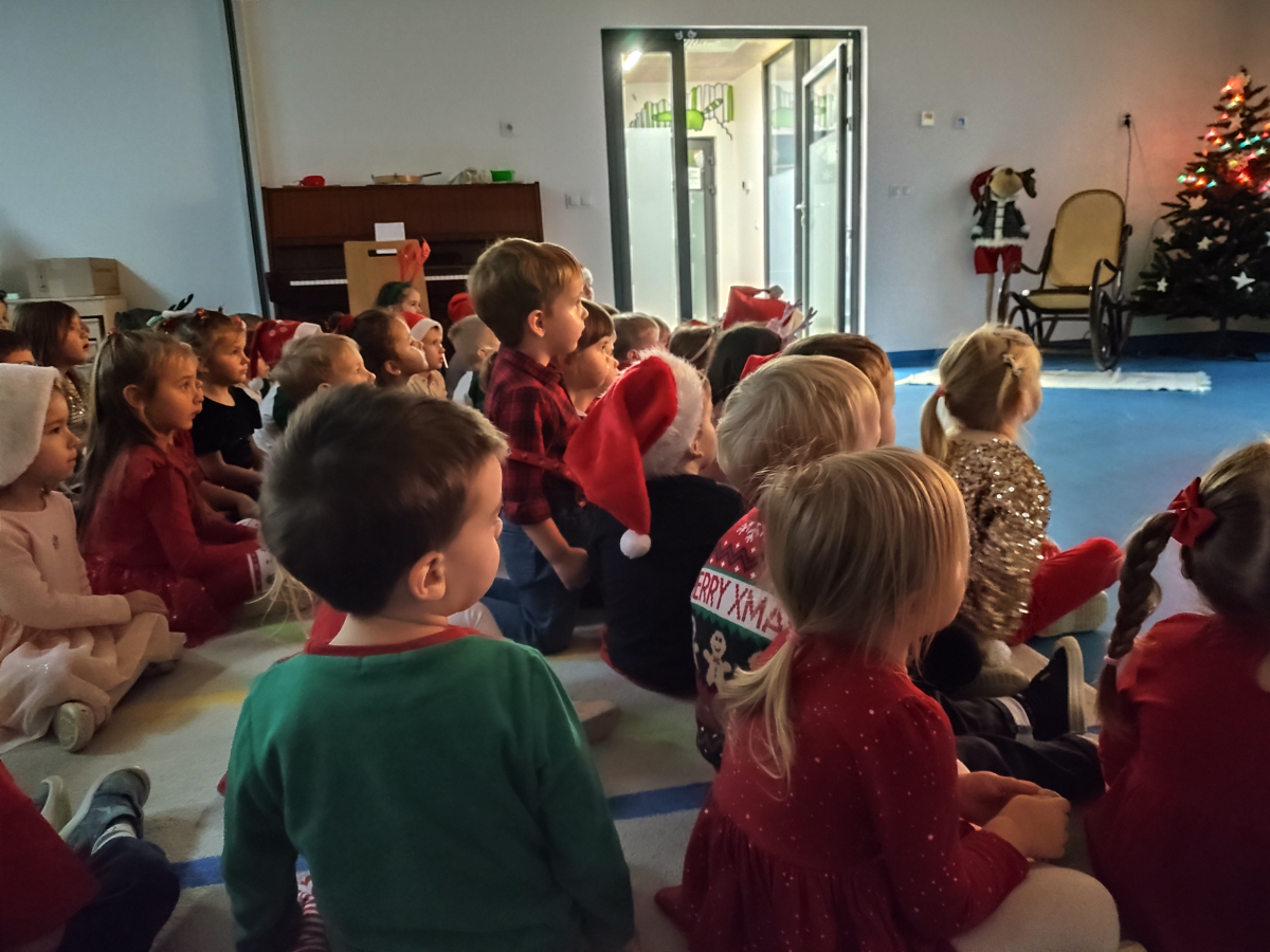 Z radością odwiedził wszystkie grupy i obdarował dzieci pięknymi prezentami. Przedszkolaki obejrzały także specjalnie przygotowany film przedstawiający wizytę Mikołaja w naszym przedszkolu. Każda grupa zaprezentowała dla niego swoją piosenkę, tworząc ciepłą, świąteczną atmosferę pełną uśmiechów i wzruszeń.